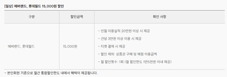 에버랜드, 롯데월드 할인입니다. 전원실적이 20만 원 이상 시 제공이 됩니다.