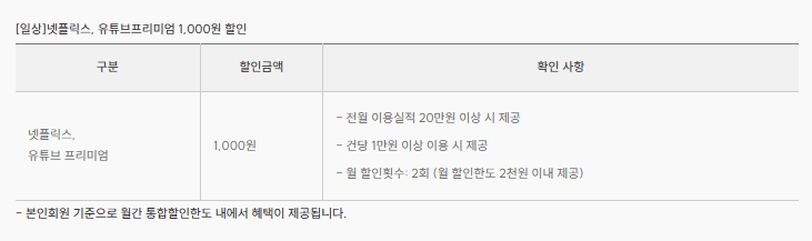 1,000원 할인이지만 매달 할인이 된다는 점 그리고 사람들이 정말 많이 이용하는 넷플릭스, 유튜브 프리미엄이라는 점에서 좋은 혜택입니다.