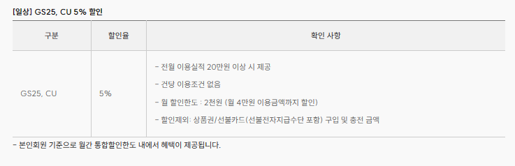 물론 5% 할인이라는 점과 월 할인한도가 아쉬운 점도 있지만 자주 이용하는 편의점이라 할인 혜택을 누리기에 좋습니다.