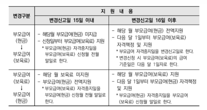 그리고 변경신청으로는 부모급여(현금) , 부모급여(보육료), 부모급여(종일제 아이 돌봄) 3가지 서비스 사이에서 서비스 변경 신청이 가능합니다.