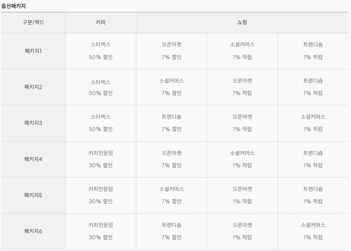 단지 이 카드는 혜택 1이 메인이라고 보는데요. 혜택 1의 경우 패키지에 따라 스타벅스나 커피전문점할인이 있는데요.