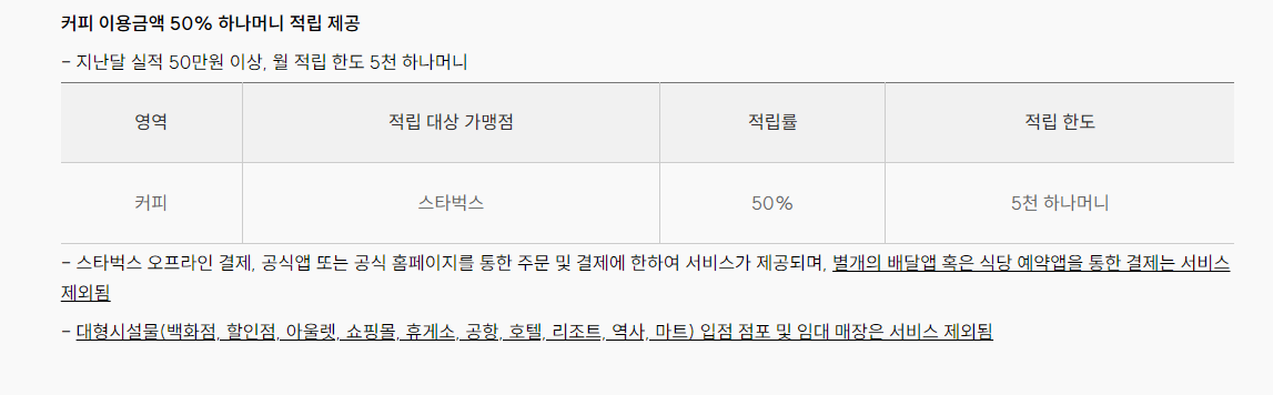 지난달 실적 50만 원 이상 시 스타벅스 50%가 적립되고 한 달 한도는 5천 원 하나머니입니다.